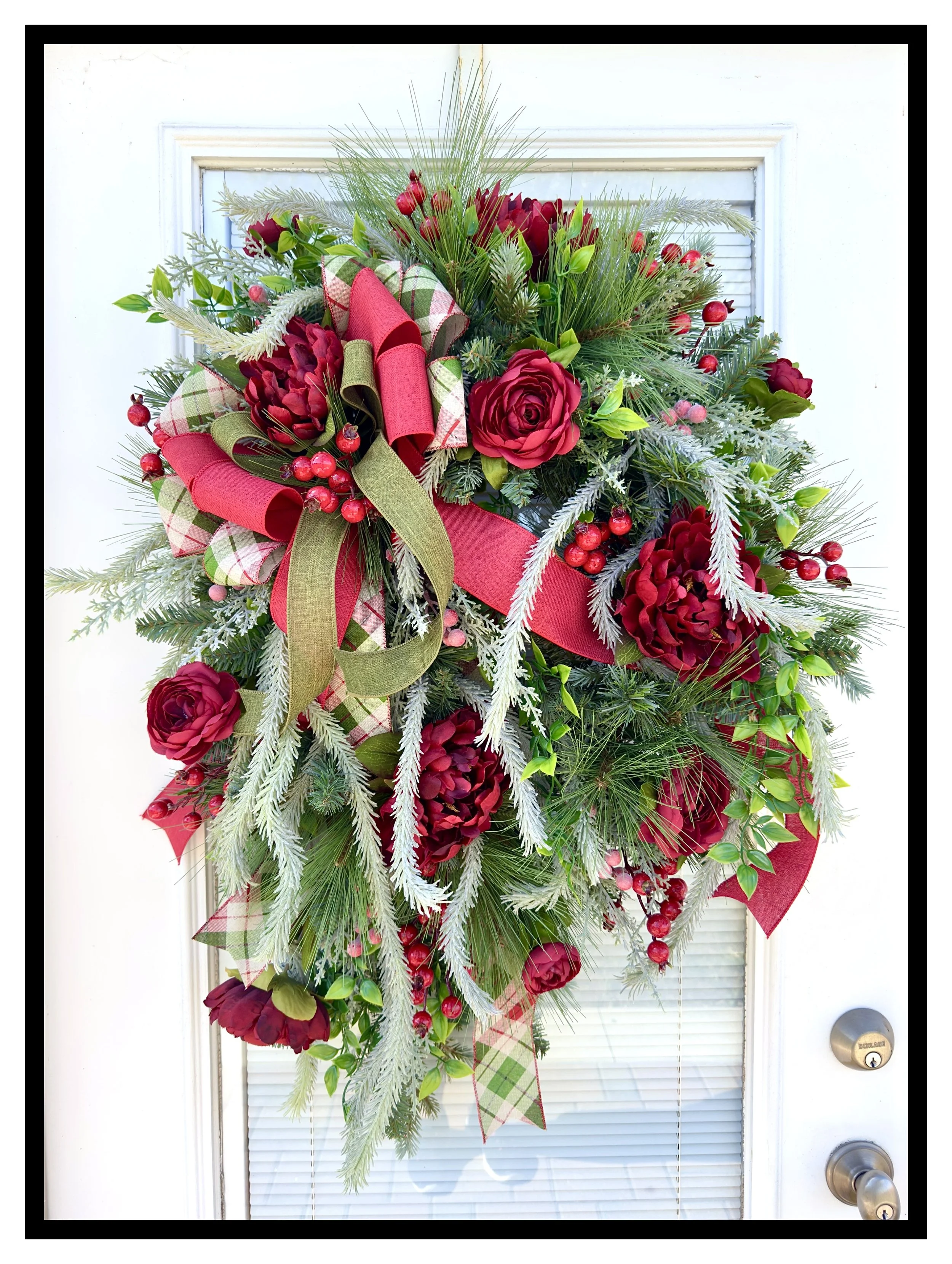 christmas winter wreath red peonies ranunculus berries triple bow and winter pines