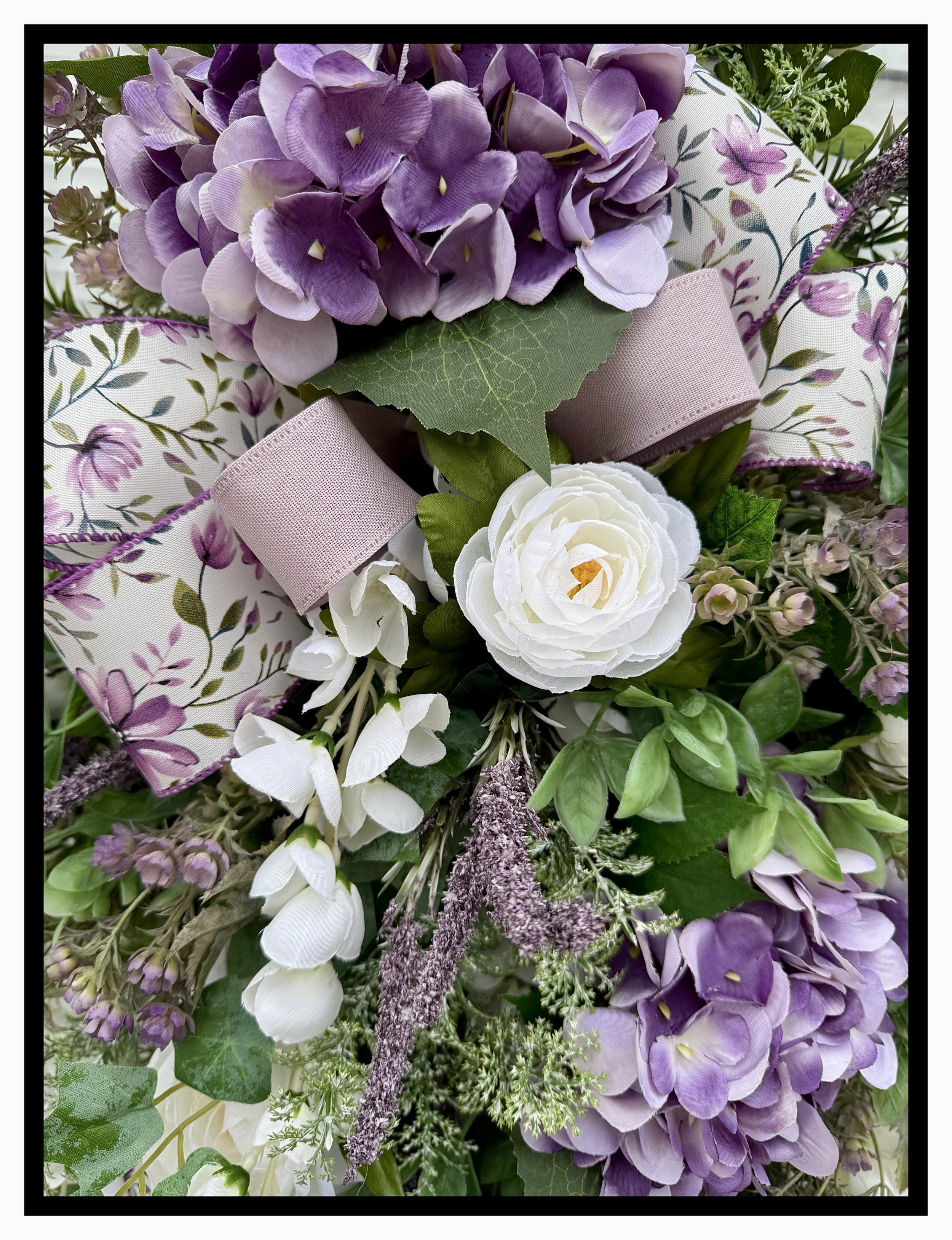 • Features lifelike purple hydrangeas, white ranunculus, and cascading wisteria.