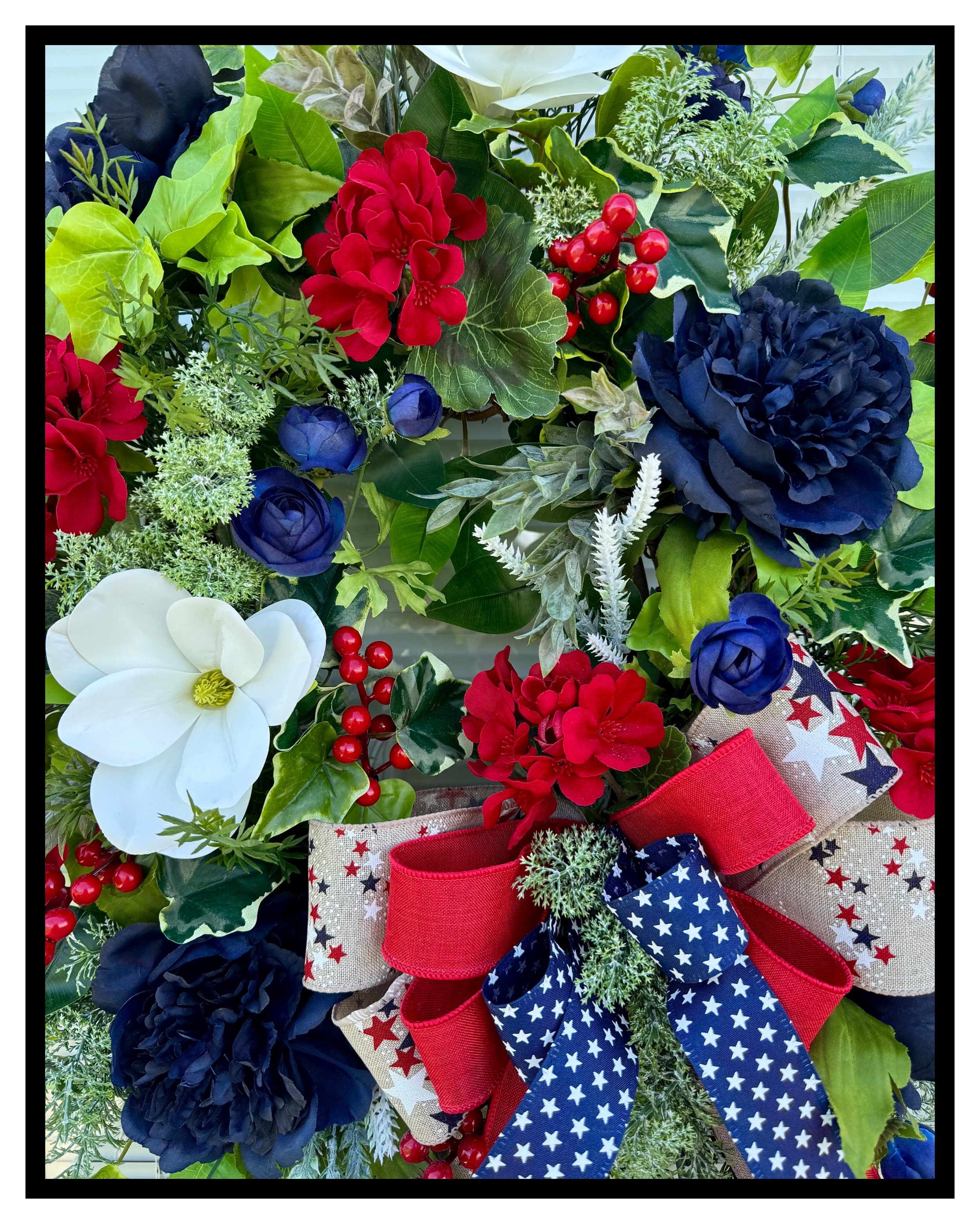 Transform your front door into a patriotic masterpiece with this exquisite floral wreath, welcoming guests with a touch of elegance and national pride.